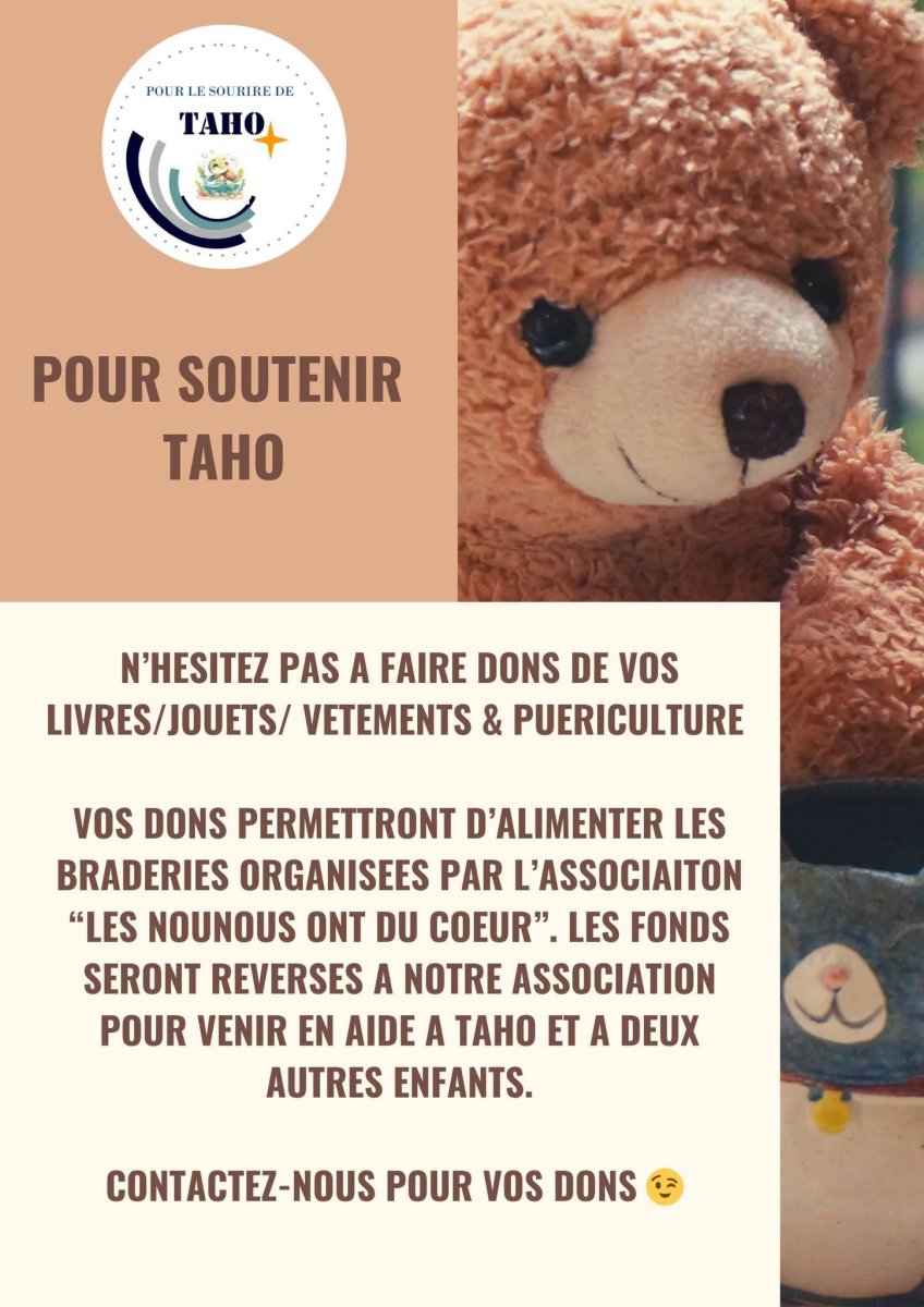 Cette année Taho sera soutenue par cette association qui notemment organise des braderies autour de la puériculture. Afin de permettre un maximum de ventes vous pouvez faire dons de jouets ou vêtements soit auprès de cette association soit auprès de nous.