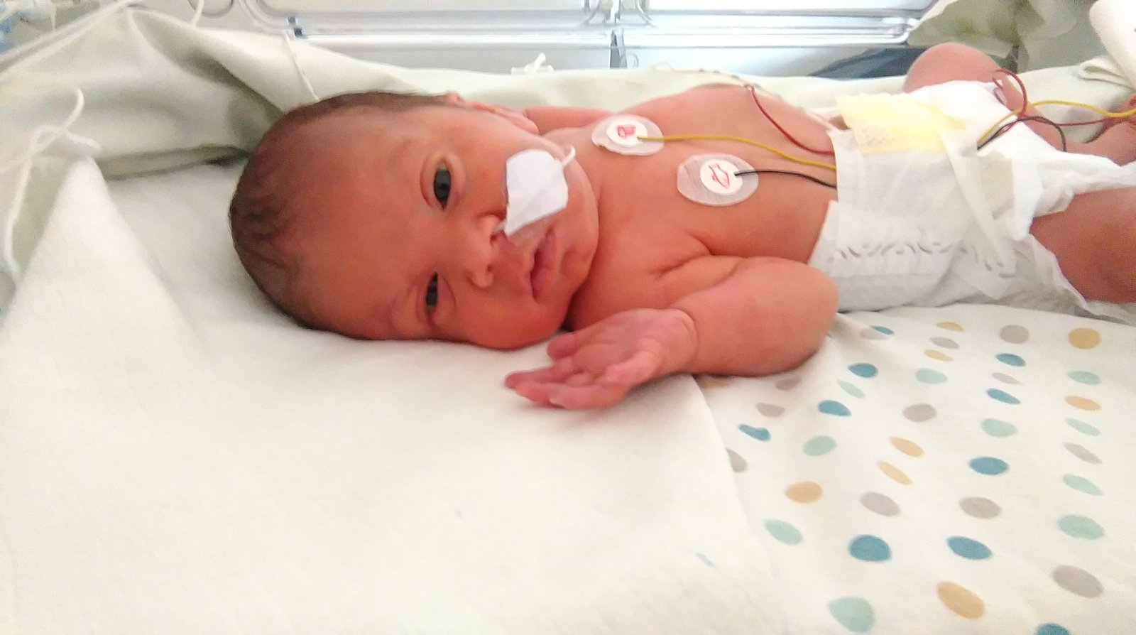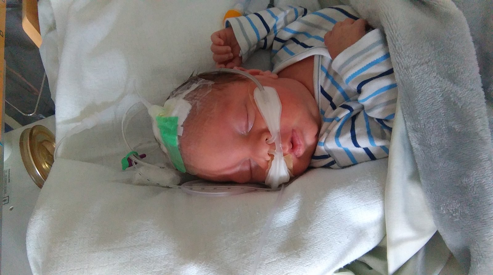 Né avec deux mois d'avance, Taho était tout de même un beau bébé de 2kg400. Malgré le besoin d'oxygène à la naissance, il a rapidement battu toute les difficultés. Certes il ne savait pas têter, il avait besoin d'une sonde nasogastrique et de kiné pour l'oralité mais au bout d'une semaine Taho savait réguler sa température et pouvait être dans une simple couveuse. Après avoir été pendant plusieurs semaines en soins intensifs nous avons pû aller en néonatologie. Au moment, où un retour (malgré la sonde nasaogastrique) était envisagé, Taho a eu des ralentissements cardiaques important... De grosses dificultés. Après une radio pulmonaire à laquelle les medecins s'attendaient à voir un oedème qui aurait pu expliquer cette difficulté, le couperet tombe. Taho souffre d'une ernie diaphragamatique. Autrement dit, Taho se retrouve avec un trou dans son diaphragme et son colon est passé au travers, faisant pression sur les poumons et le coeur. L'opération est urgente et vitale pour lui. Nous apprendrons d'ailleurs plus tard, par un medecin; que cette opération est pour la plupart mortelle surtout à l'âge de Taho à l'époque.